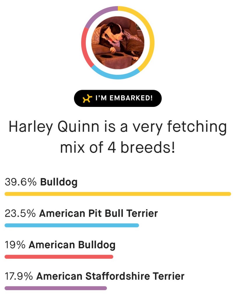 We did doggy DNA for Harley Quinn and Leo Spartacus. Yes, my husband gave Leo a middle name. We used Embark. Here are the results